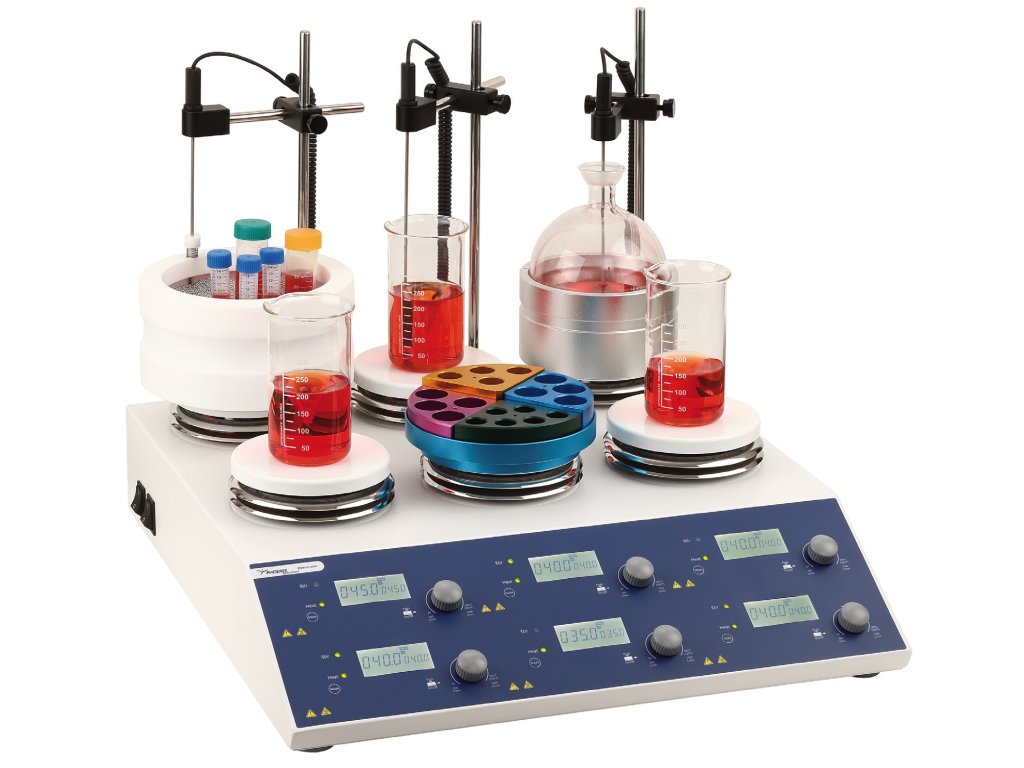 Robustní yhřívaná magnetická míchačka umožňující nezávislé míchání a vyhřívání až 6i roztoků. Chemicky odolný povrch vyhřívaných plošek je ocel s keramickým povrchem. Každá pozice má svůj kontrolní displej a ovládání. Míchačka je dodávána s externí teplotní sondou. PT-1000 včetně držáku.